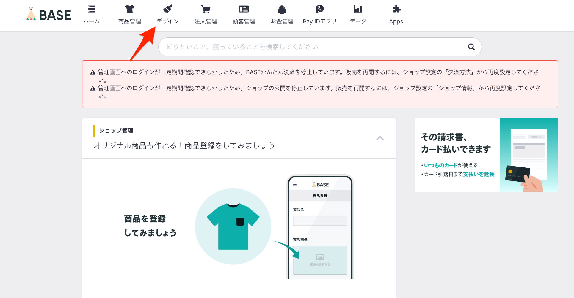 続いて、デザインの調整を行いましょう。BASEにログインし、上部のツールバーから「デザイン」をクリックします。
