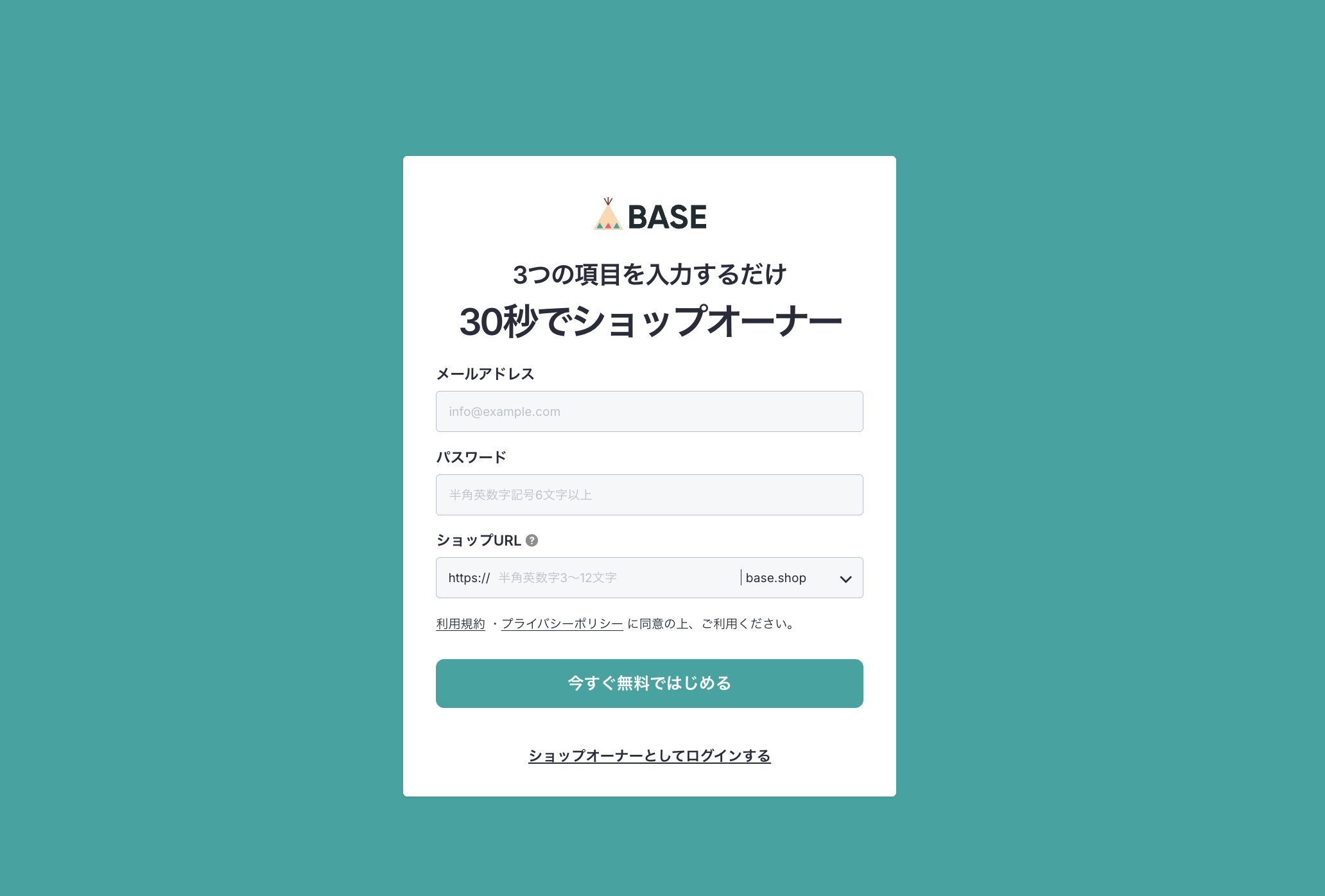ショップ開設の方法も簡単。まず、BASEのアカウト開設ページに移動します。