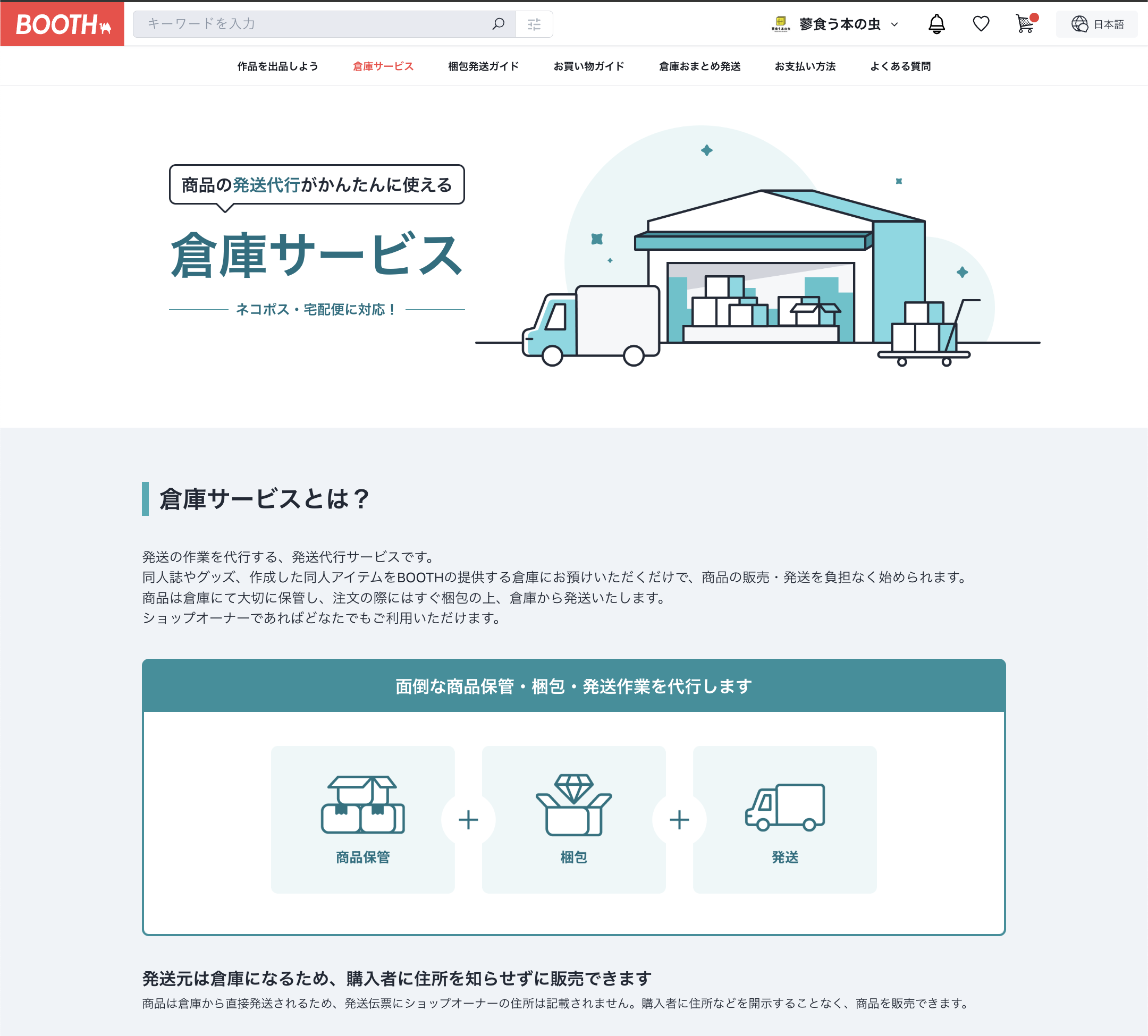 発送代行サービスでは、BOOTHの倉庫に商品を送ることで、注文があった場合にBOOTH側で梱包・配送を行ってくれるサービスです。また、発送元が倉庫になるため、購入者に住所を知らせずに販売できることもメリットのひとつです。