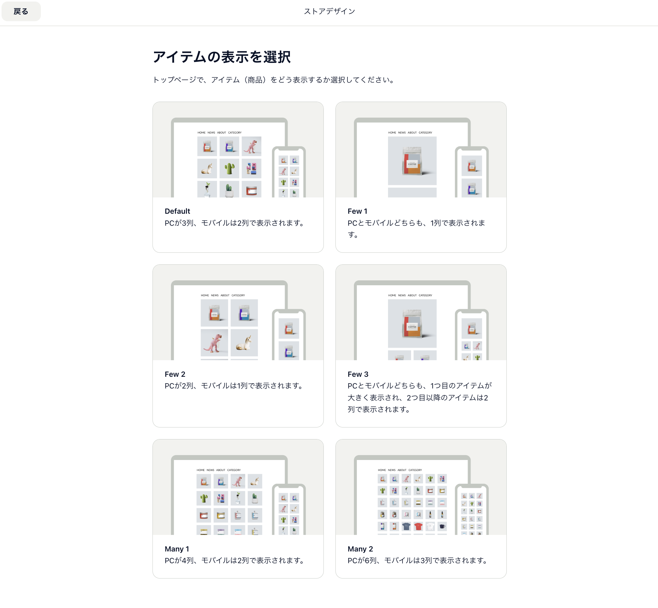 「かんたん設定」を選ぶと、まずは商品の表示形態から選択することになります。取り扱う商品数などに合わせて選ぶのが良いでしょう。